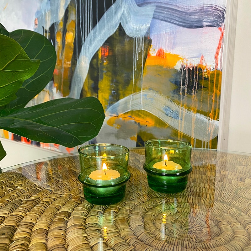 The finest small tealight holders in hand-blown, green recycled glass. Creates a cozy and warm atmosphere in the home. The tealight holders can easily be combined with Tibladin's same tealight holders in transparent recycled glass, which will create a beautiful play of colours.