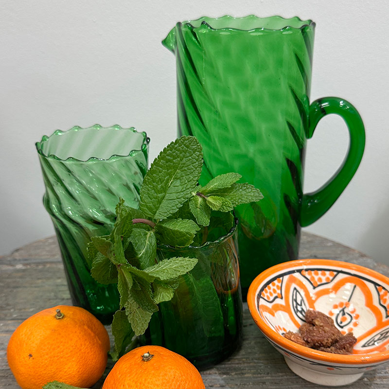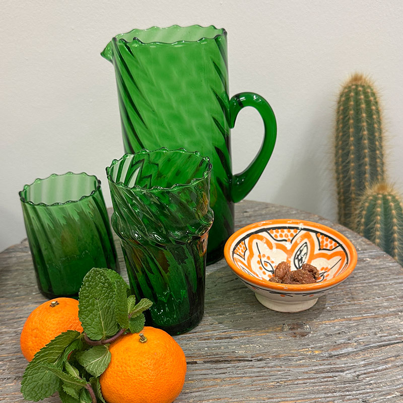 Verre Beldi de Marrakech. Le tout fabriqué à partir de verre recyclé chauffé, soufflé à la bouche, façonné et enfin progressivement traité dans un four de refroidissement. Le verre passe par un processus artisanal complexe et est façonné en designs élégants.