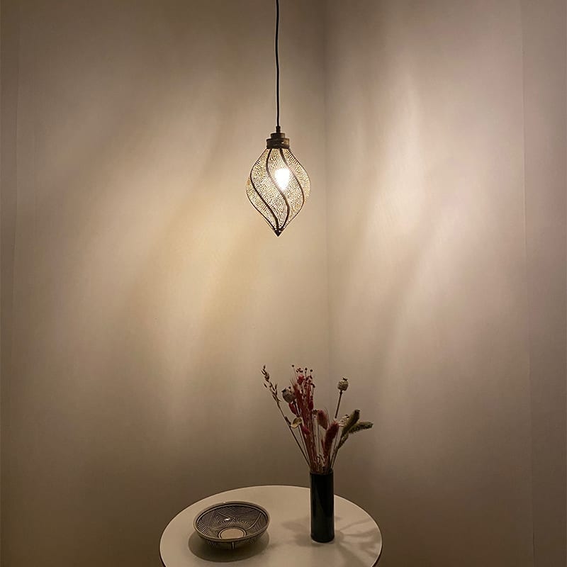 Den andre typen lampe vi tilbyr er vår elegante metalllamper i gull og sølv. Med sitt fine håndskårne mønster får du den perfekte «Tusen og én natt»-stemningen! Lampene sprer et vakkert lys i rommet, og spesielt når det er helt mørkt i rommet, får du denne wow-effekten. Vi har lamper som passer til ethvert formål. Hvis du mangler lys i kosekroken din, er vår unike vridd pendellampe perfekt. Bordlampene passer også bra i kosekroken, men også i bokhyllen eller nattbordet. Hvis du ønsker en rund bordlampe, har vi en sølvfarget en i Marokkansk mønster og en med hullmønster. Den firkantede bordlampen sprer en koselig atmosfære med sin eleganse og unike, annerledes form. Bordlampen er tilgjengelig i sølv og gullmetall.