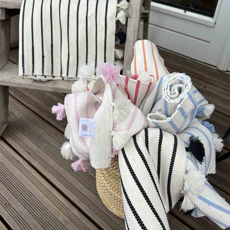 Deze prachtige Marokkaanse badmatten zijn handgeweven van 100% katoen en kunnen gebruikt worden in de badkamer of gastenbadkamer. De matten zijn gemaakt in mooie, heldere en zomerse kleuren, die met hun kleine kwastjes een mooie en lichte toets toevoegen. De badmat kan ook gebruikt worden als vloerkleed voor de entree of logeerkamer. De matten zijn perfect voor zowel het Scandinavische als stijlvolle huis, met de heldere en strakke kleuren, maar zijn ook geschikt voor het zomerhuis of de tuin. Dan haal je de Marokkaanse en zomerse sfeer in huis. Gemaakt in samenwerking met ontwerper in Marrakech.