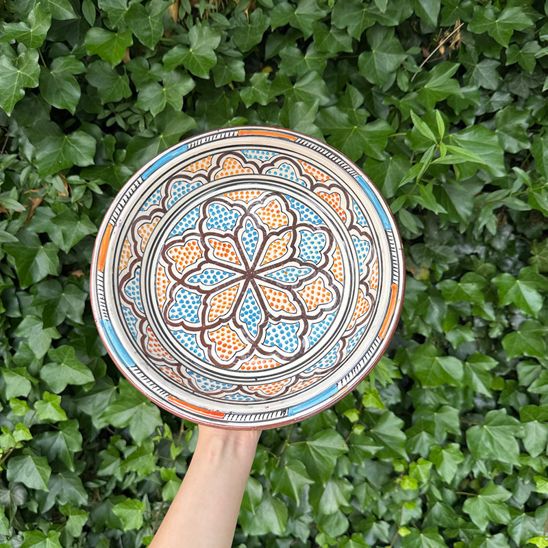 Prachtige Marokkaanse couscousschotel met een uniek Marokkaans patroon. heeft een diameter van 28 cm en een hoogte van 5 cm.