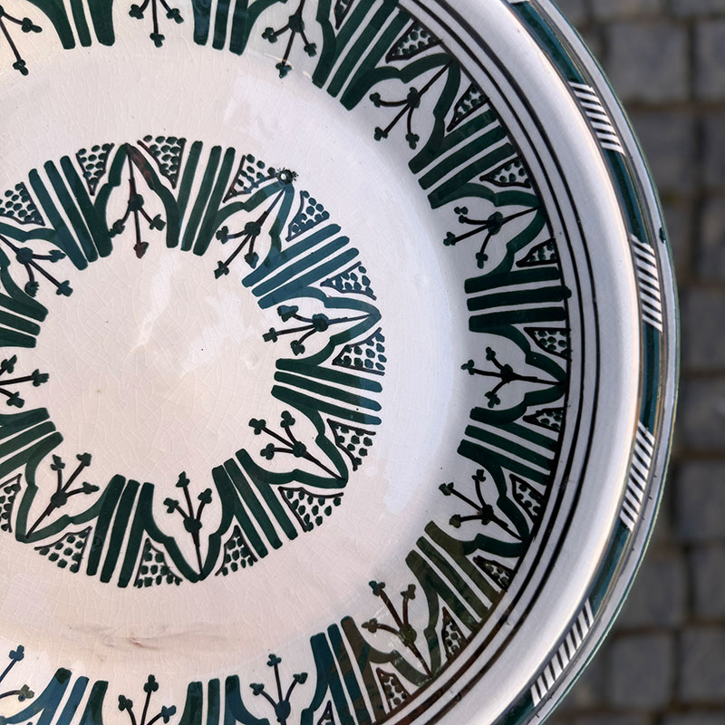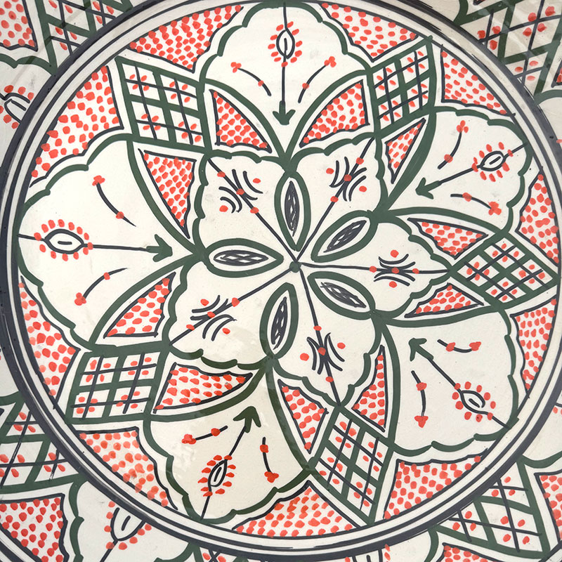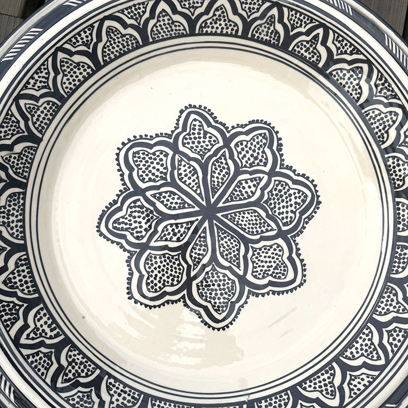 Prachtige Marokkaanse couscousschotel met een uniek Marokkaans patroon. heeft een diameter van 48 cm en een hoogte van 6 cm. De hoge, ronde rand zorgt ervoor dat grotere porties in de schaal blijven en niet over de rand vallen.