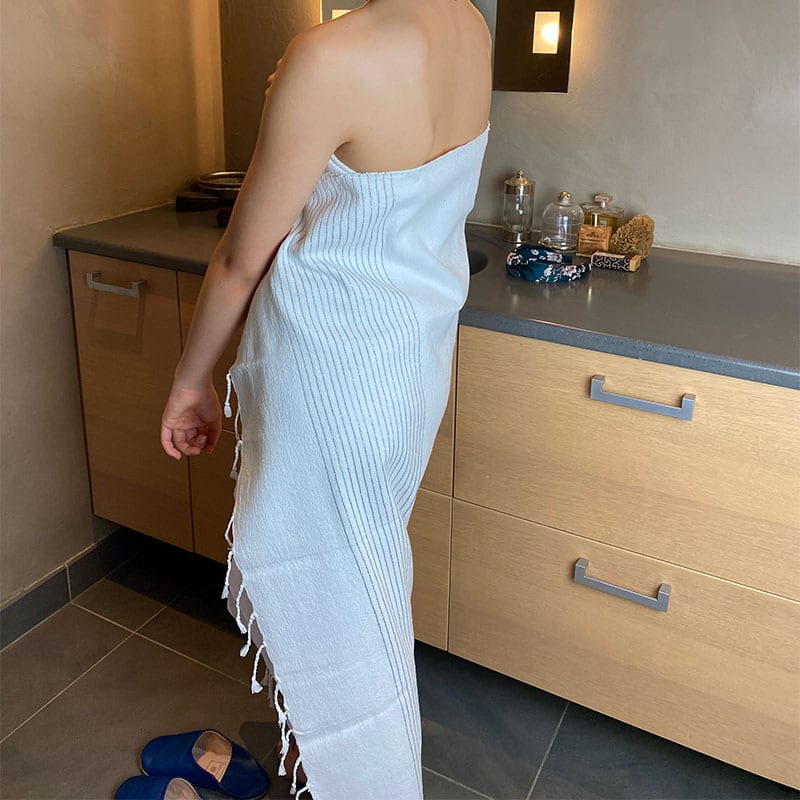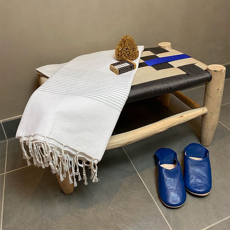 De hamamdoeken zijn gemaakt in samenwerking met een lokale ontwerper in Marrakech, waar we de Marokkaanse traditie van hamamdoeken hebben verenigd met de Scandinavische lichte expressie.