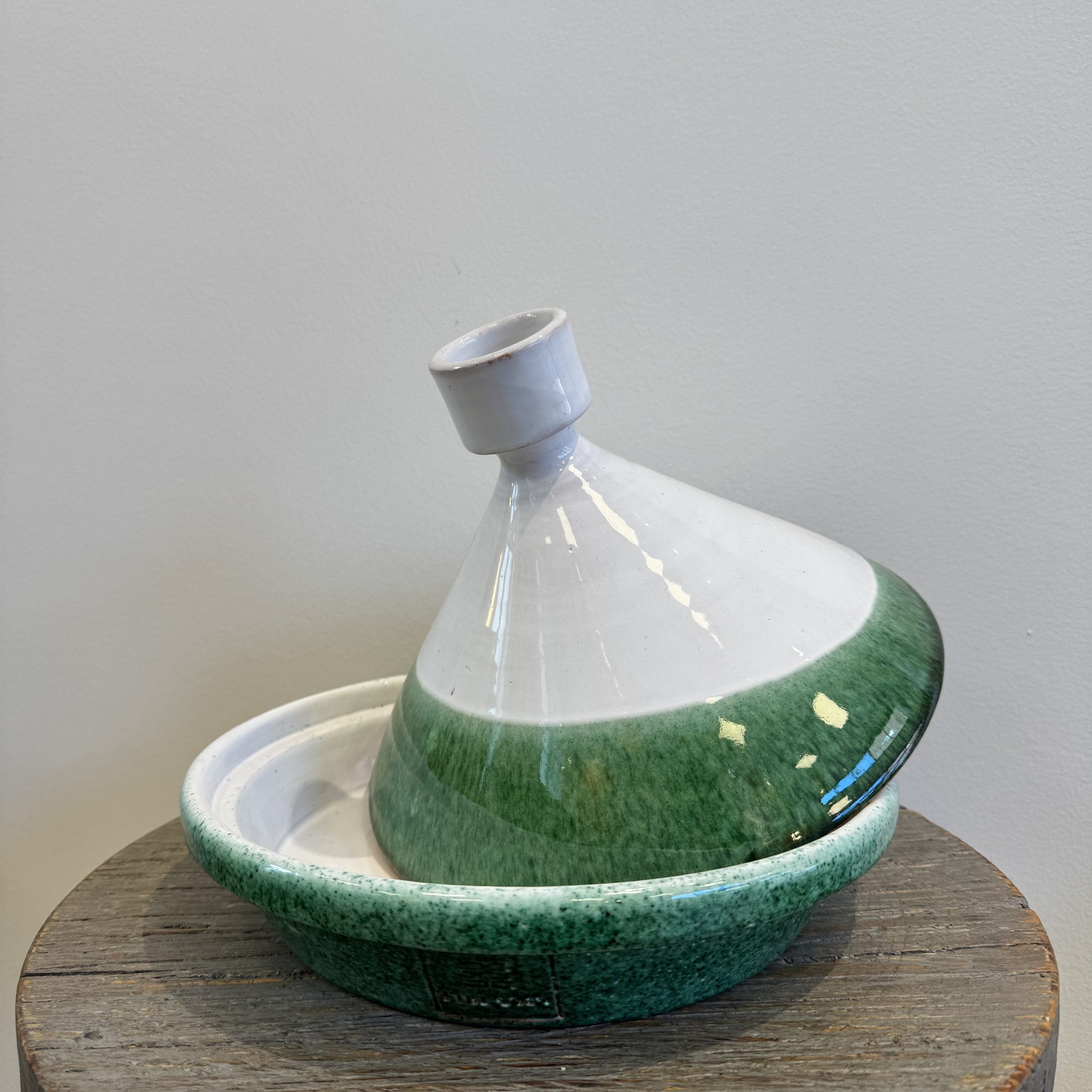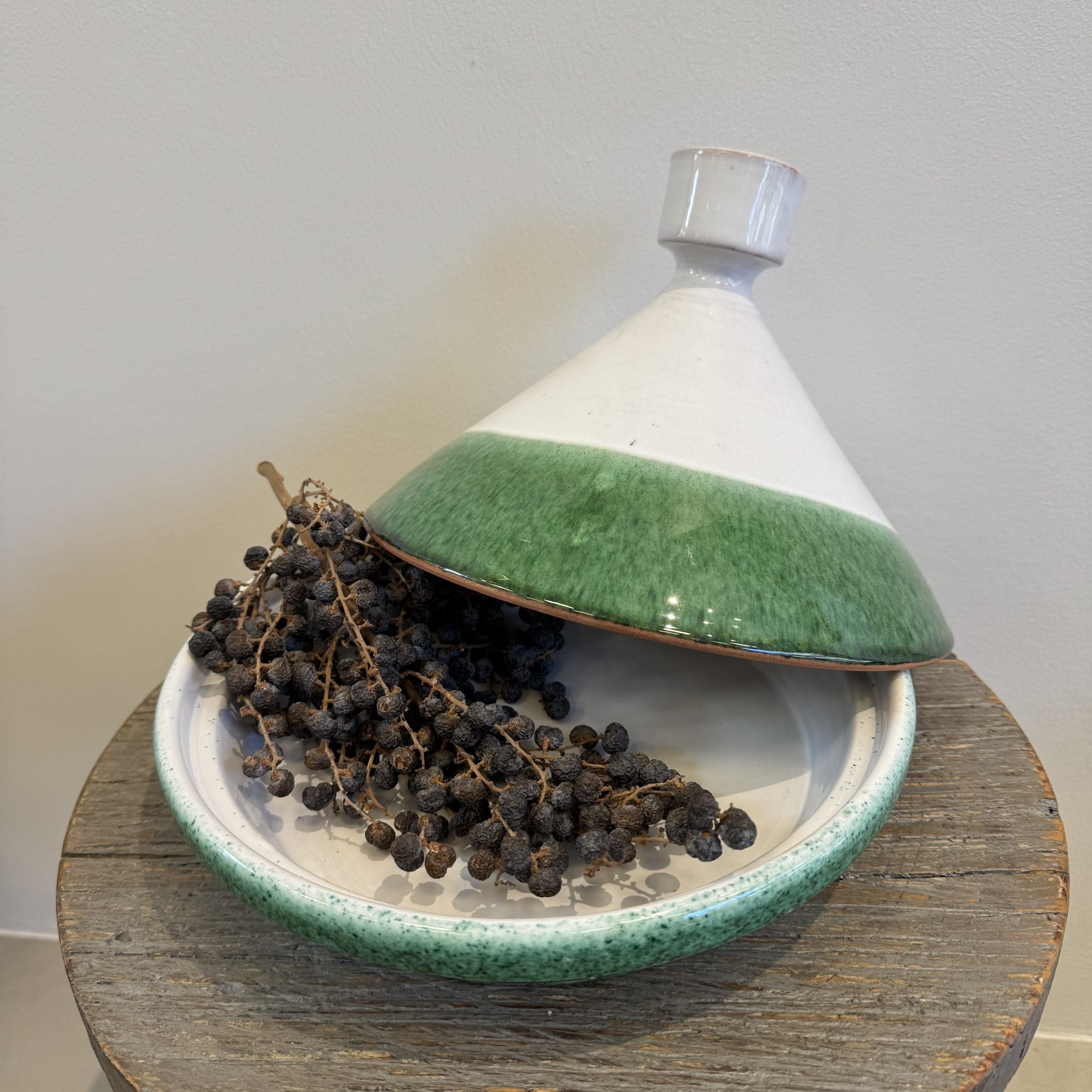 Onze prachtige serveertajines zijn ontworpen door Tibladin en handgemaakt in Marokko. Ze hebben een tijdloze uitstraling met witte en groene tinten. De iconische vorm is geïnspireerd op de traditionele Marokkaanse tajine, die al eeuwenlang wordt gebruikt om sudderende gerechten te bereiden.