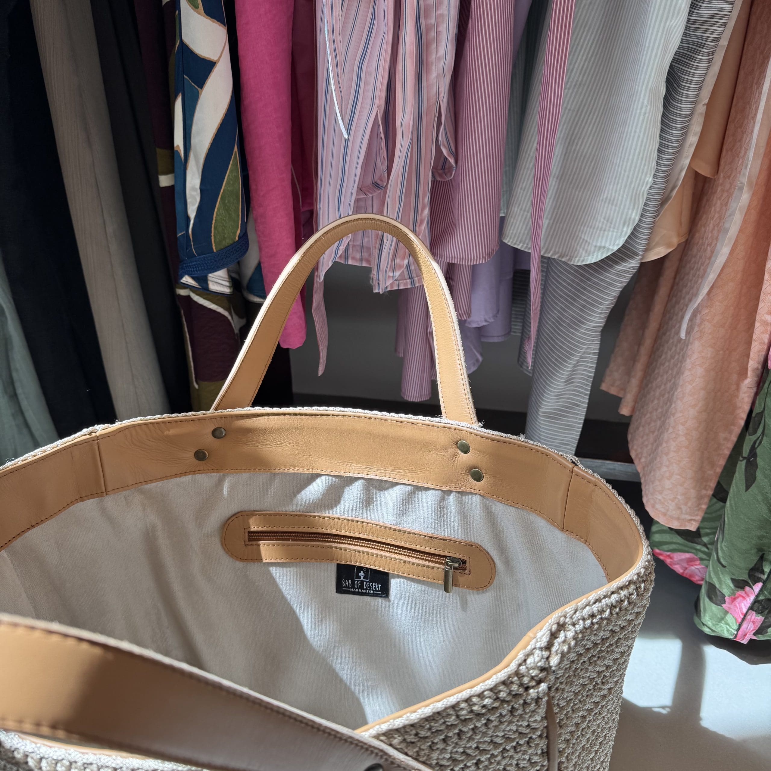 Der er ikke noget bedre end at bære noget unikt! Stropper, kanter og lomme i en smuk brun kvalitetslæder. Inde i tasken er der en lille lomme der kan lukkes med lynlås. Selve tasken er åbent med en masse plads.